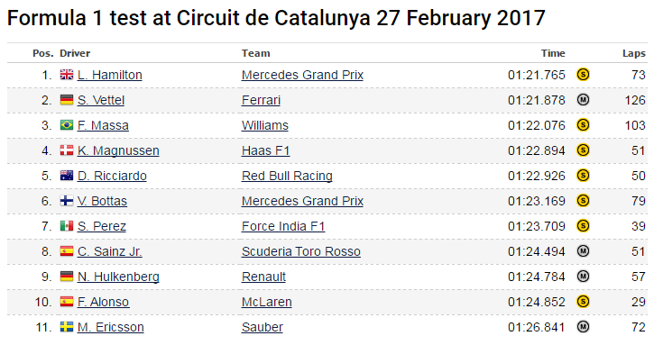 По-горе можете да видите времената на всички пилоти, взели участие в първите тестове.
